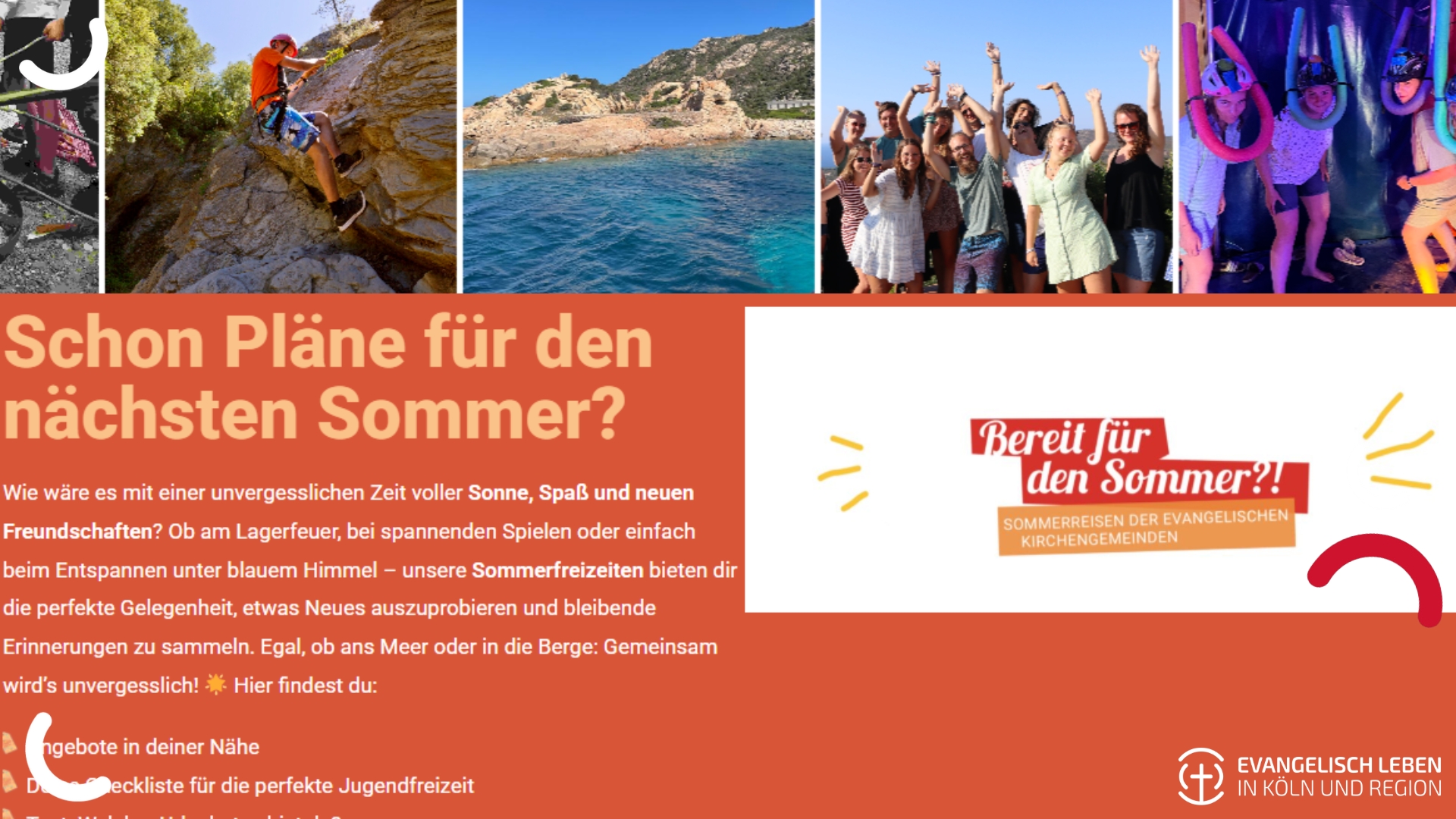 Schon jetzt laufen vielerorts die Planungen für den kommenden Sommer. Auf der Internetseite kirche.me/freizeiten finden Kinder, Jugendliche und Eltern eine übersichtliche Sammlung evangelischer Freizeiten in Köln und Region. Die Plattform bündelt die vielfältigen Angebote der Kirchengemeinden und macht sie zentral auffindbar – von kurzen Angeboten in der Nähe bis zu mehrwöchigen Reisen im In- und Ausland.